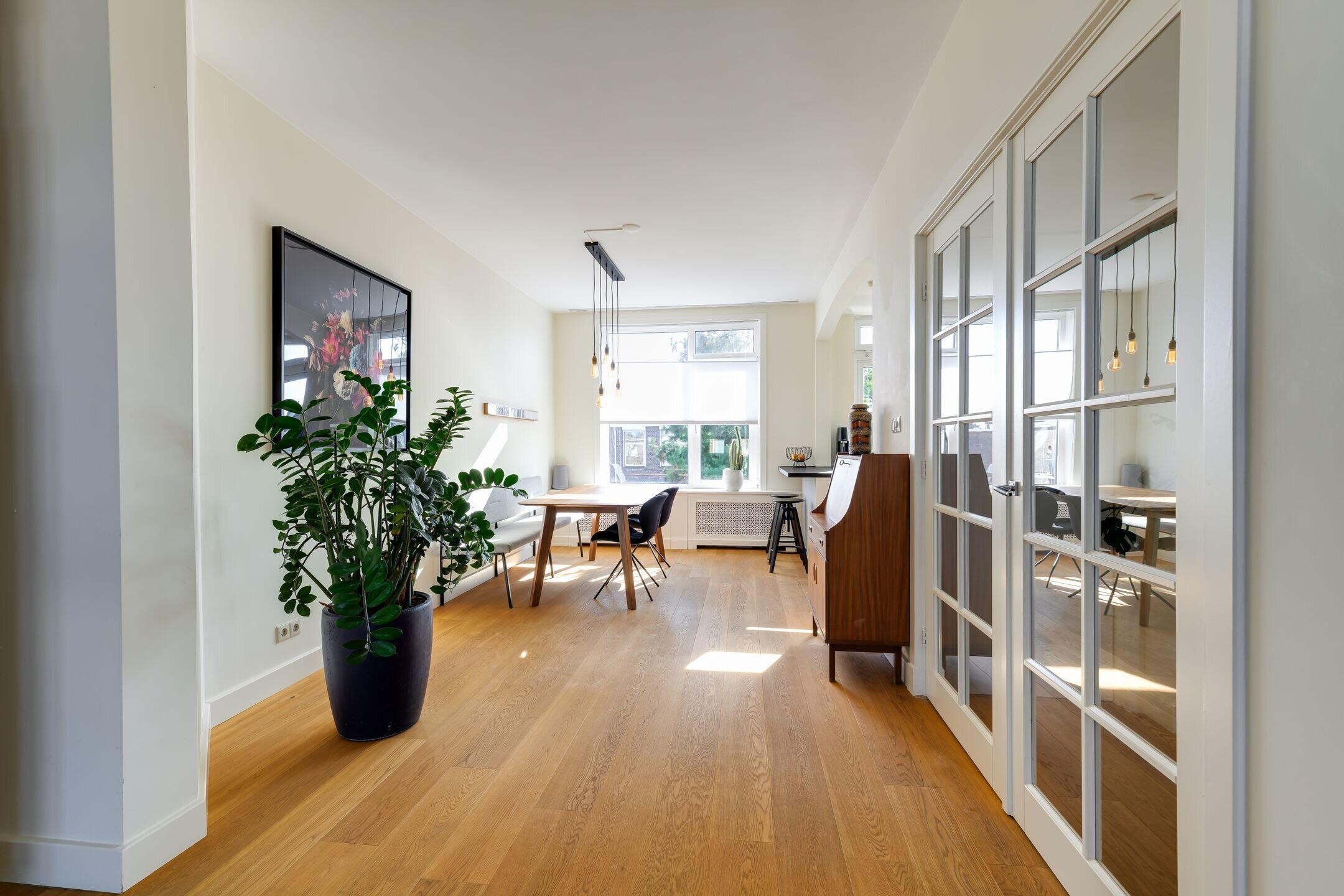 - Een houten vloer door de gehele woning (m.u.v. de badkamer)