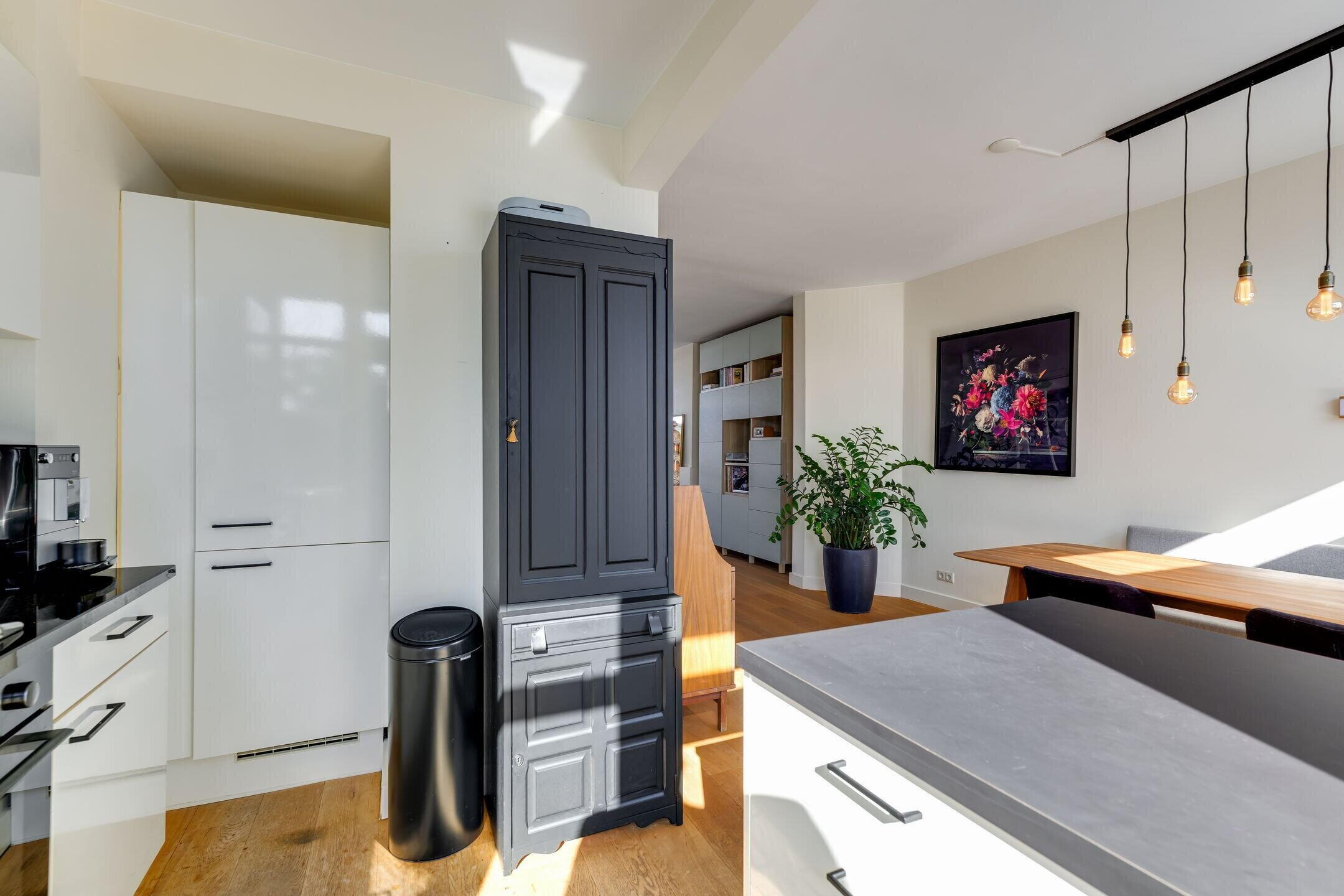 Ruime entree met een meterkast en trapopgang naar de woonetage (2e verdieping). Hier bevinden zich een modern toilet met fonteintje en een garderobekast met daarin de opstelplaats voor een wasmachine en de CV ketel (Intergas uit 2024). Door de glazen openslaande deuren bereik je de woonkamer en-suite met aan de achterzijde de woonkeuken met vrij uitzicht en een deur naar het zonnige balkon (zuid-oost). De keuken is voorzien van een 4-pits gaskookplaat met afzuigkap, een combi-oven (2020), een koel-vrieskast, een vaatwasmachine (2025) en een eiland met veel opberggelegenheid.